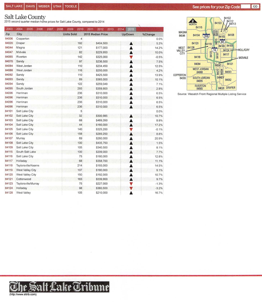 South Salt Lake has 2 zip codes and the 2015 median home price for 84115 is $209,000 and the 2015 median home price for 84106 is $289,250 up 8.8% from last year.